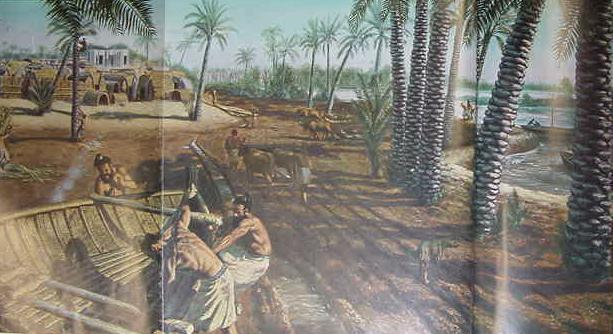 I taught 7th Grade "Cultural Geography," man's inter-relationship to the land. The most important event in the history of mankind was when he ceased to be a roaming naked wild animal and became "civilized." This momentuous event was accomplished in the following manner: Speaking Anthropologically, man at first was an animal, he roamed naked with other beasts. He ate what they ate, wild herbs of the field and fruit from trees. He drank at watering holes with the animals. Then he became a "gatherer-hunter," still nomadic. Then the great revolution occured, man settled down, built villages and then cities, and became civilized and wore fine clothes made from plant fibers on looms. What made this "civilization" possible? It was man's becoming a domesticator of animals for food and his becoming an agriculturalist, growing and raising food to eat. In Lower Mesopotamia, he achieved this via the creation of canals and irrigation sytems for gardens supporting fruit trees, vegetables, date palms, etc., said gardens being associated with a nearby village or city.