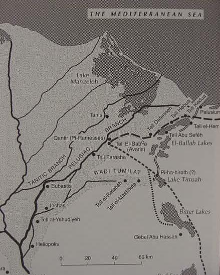 Map of Eastern Delta showing Zoan (Greek: Tanis), Ramesses (Qantir), Avaris (Tell ed Daba), Tell er Retabeh, Tell el Maskhutah. Ancient canal traces are noted as Hoffmeier and Kitchen argue Pi-ha-hiroth means "mouth of the canal." A small Egyptian shrine was found at Gebel el Hassa, the inscriptions being usurped by Ramesses II.Some argue this location is Baal Zephon as the Egyptian god Set appears on a relief and he was equated by the Egyptians with the Syrian war god Baal. The dotted lines mark the Exodus route. Succoth is understood to be a region within Wadi Tumilat. Etham being the east end of the Wadi or near Lake Timsah (cf. the map in James K. Hoffmeier. Israel In Egypt, The Evidence for the Authenticity of the Exodus Tradition. 1996. Oxford University Press. New York).