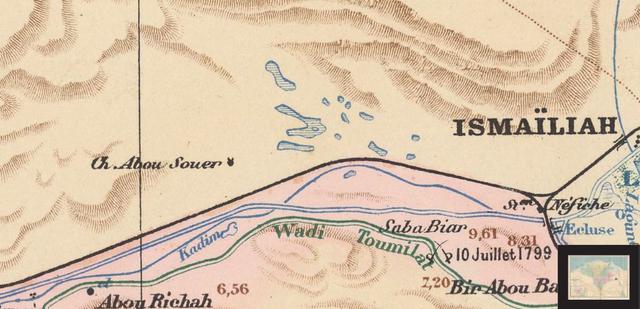 Below, close-ups of the above map published in 1826 but surveyed in 1796-1798 showing Bir Abou Soyair (Abu Suwayr) on the track going to Belbeis in the Delta from Bir Makdal ENE of Timsah. To the viewer's lower right corner is a portion of Lake Timsah.